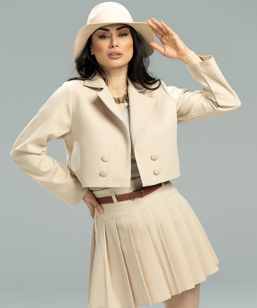 ست کت دامن مدل تنیسی با رنگهای آبی، کرم، قهوهای، سرمهای، استخونی و مشکی سفید ارائه شده است.